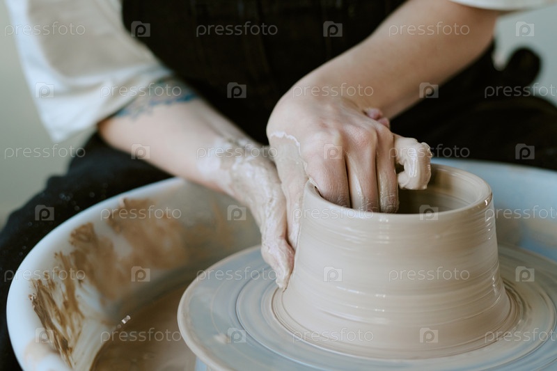 Молодая взрослая женщина формирует глиняный горшок на керамическом колесе в помещении