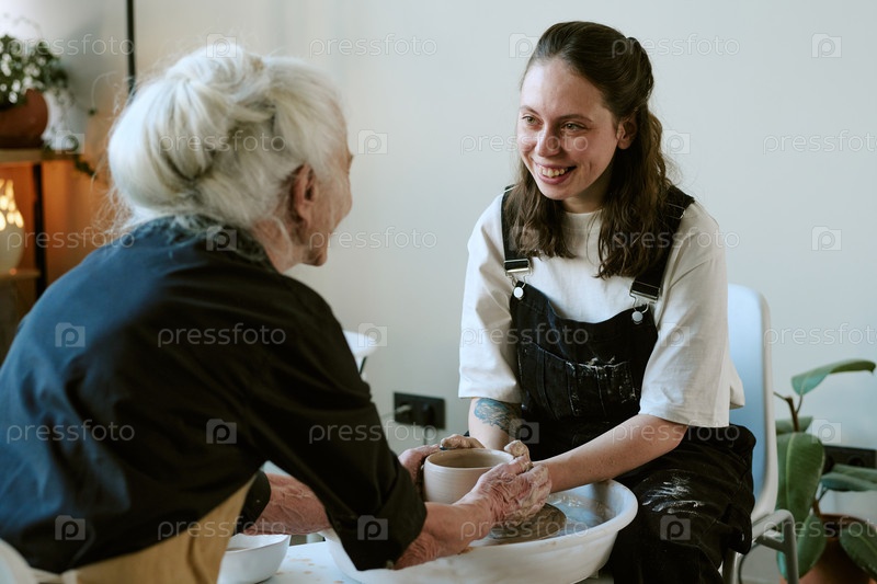 Старшая мать направляет молодую взрослую дочь создание керамического изделия