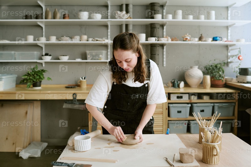 Молодая взрослая женщина скульптурирует глиняные плиты, сосредоточиваясь в помещении