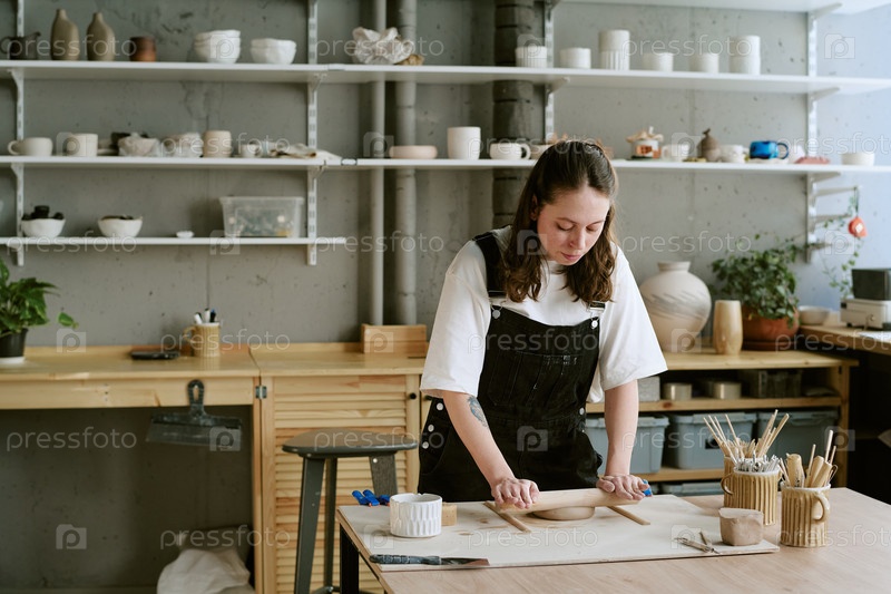 Молодая женщина формирует глину с помощью роликового булава в студии керамики
