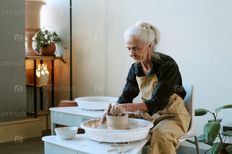 Женщина, формирующая глиняный горшок на керамическом колесе в старшей студии