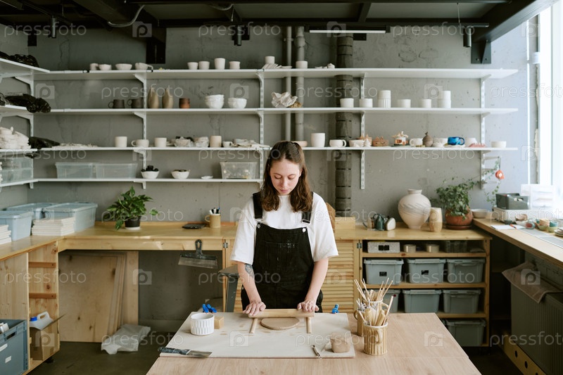 Молодая женщина формирует глину в студии керамики, окруженной гончарными изделиями
