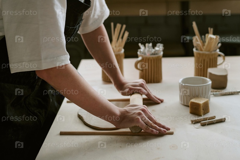 Молодая взрослая женщина формирует глину с помощью роликового булава во время керамической мастерской