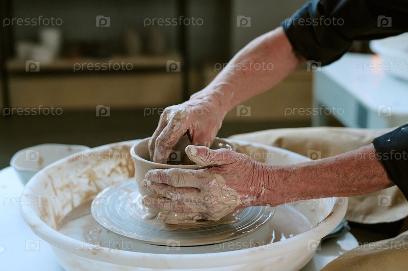 Женщина, формирующая глиняный горшок на гончарном колесе в старшей студии по керамике