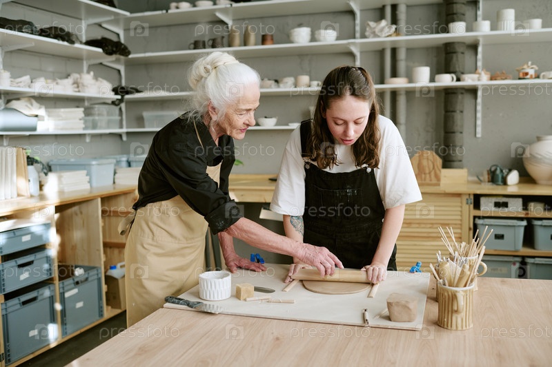 Старшая женщина преподает молодой взрослой женщине керамику