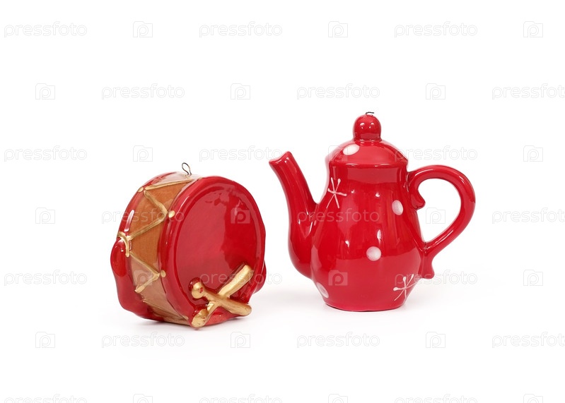 Красные керамические рождественские игрушки (кетель и барабан) изолированы на белом фоне
