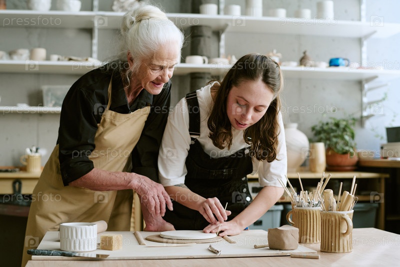 Старшая женщина осуществляет надзор за молодой взрослой женщиной, вырезающей глиняный диск
