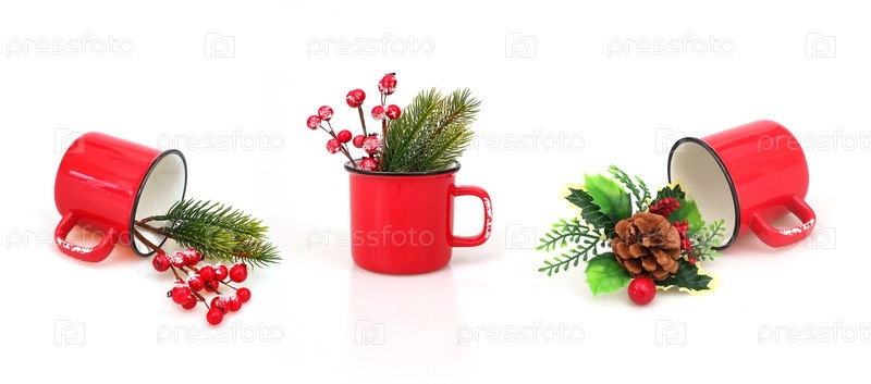 Мокап: Рождественская композиция с красной кружкой, изолированной на белом фоне