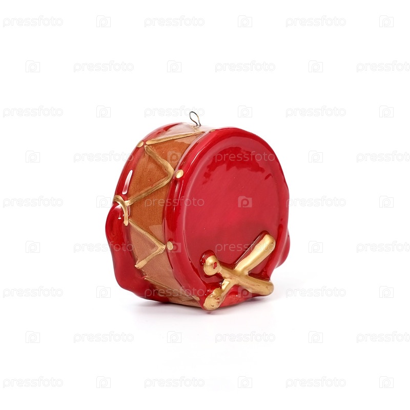 Красная керамическая рождественская игрушка (маленький барабан) изолирована на белом фоне