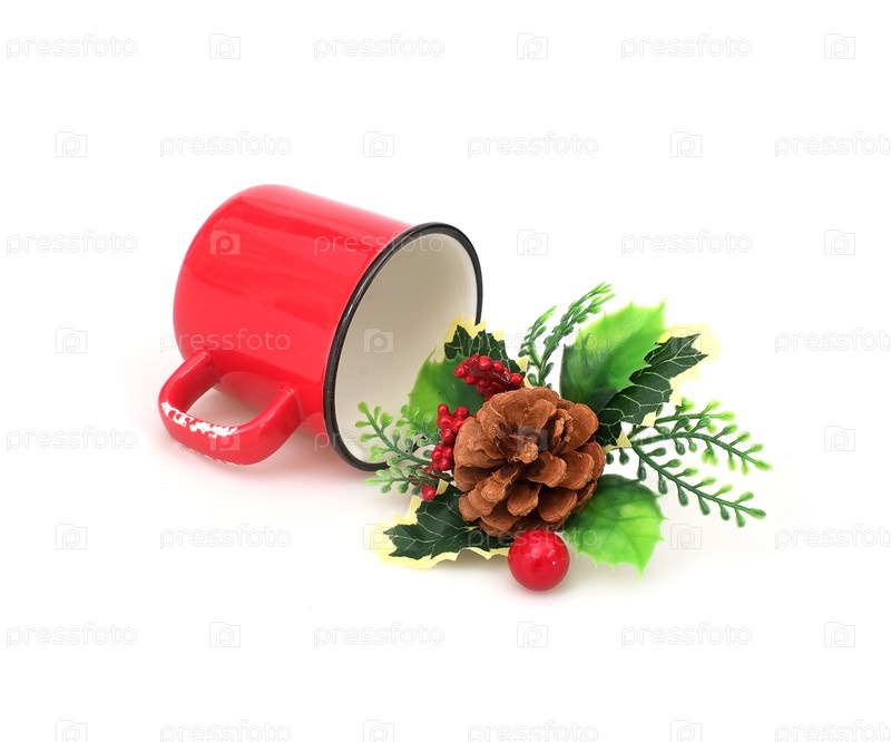 Мокап: Рождественская композиция с красной кружкой, изолированной на белом фоне