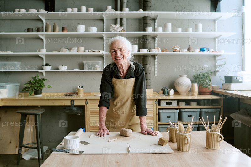 Портрет старшей женщины, улыбающейся во время работы в керамической студии