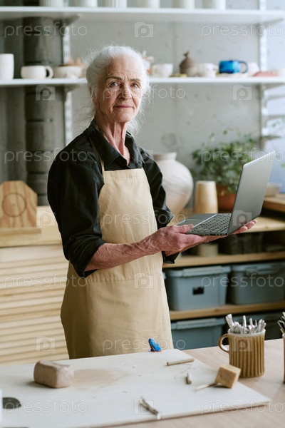 Старшая женщина держит ноутбук, стоя в керамической мастерской