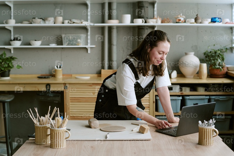Молодая взрослая женщина скульптурирует глину, используя ноутбук в студии керамики