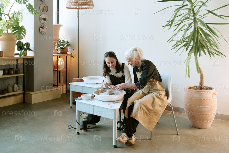 Старшая женщина обучает молодую взрослую женщину технике керамического колеса
