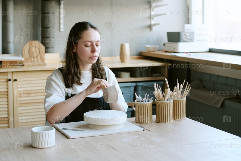 Молодая женщина формирует керамическую посуду в студии современного искусства