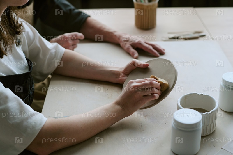 Молодая женщина формирует глиняную плиту во время керамической мастерской