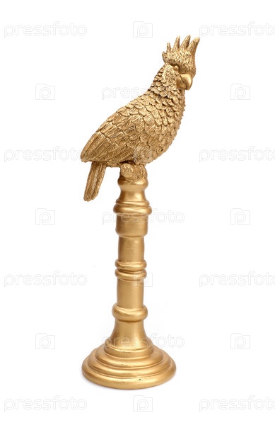 Золотая тропическая птица (папуга на столбе) изолирована на белом фоне