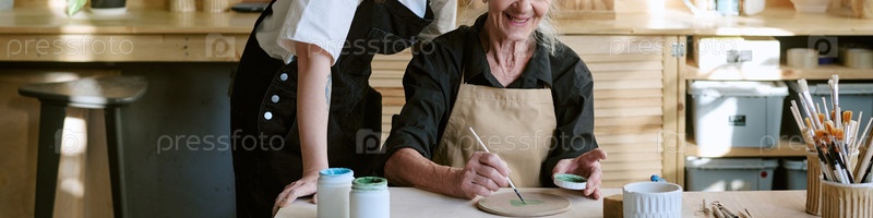 Глава старшей женщины рисует керамическую плиту, в то время как молодая взрослая женщина помогает
