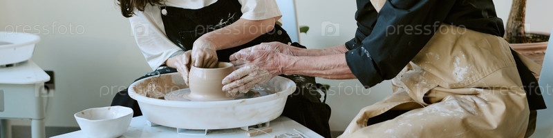 Header of Женщина среднего возраста, направляющая молодую взрослую женщину в формирование глиняного горшка