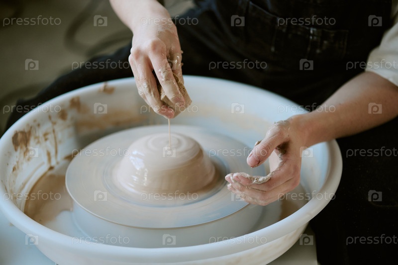 Молодая взрослая женщина формирует глину на керамическом колесе в студии