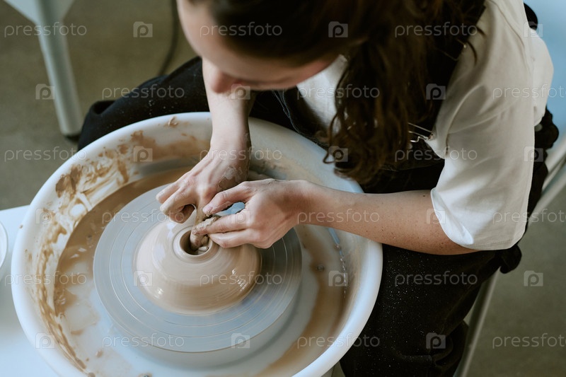 Молодая взрослая женщина формирует керамическую чашу на электрическом гончарном колесе