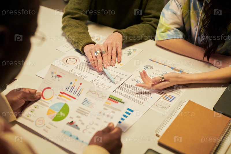 Различные молодые люди сотрудничают над бизнес-аналитикой за офисным столом