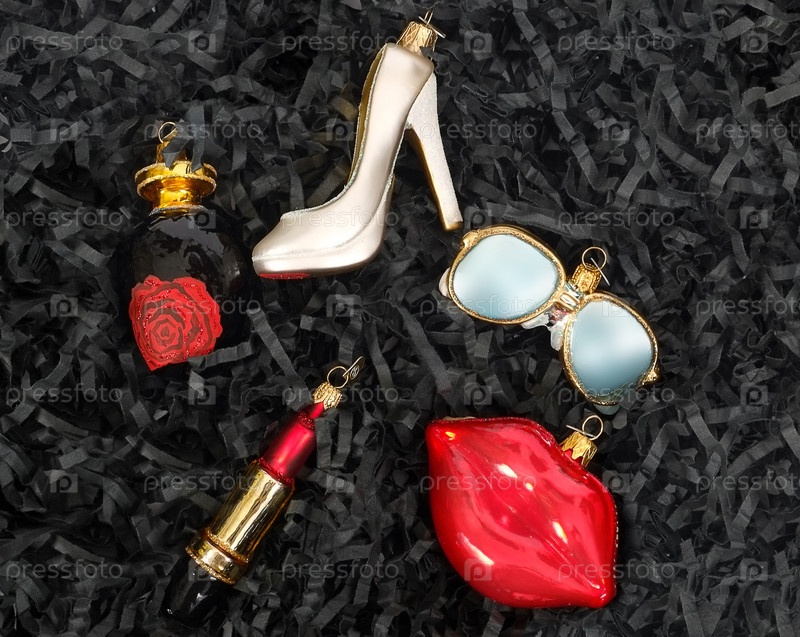 Рождественские рождественские игрушки в виде модных аксессуаров, изолированные на черной бумаге