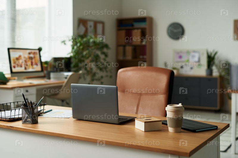 Office Desk Featuring Laptop Tablet Coffee Cup and Stationery Supplies Офисный рабочий стол с ноутбуком и планшетом, кофейная чашка и канцелярские принадлежности