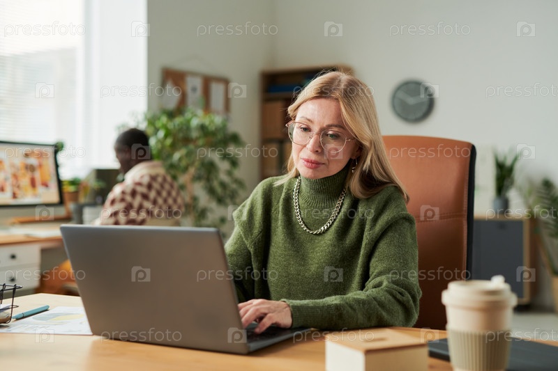 Взрослая женщина работает на ноутбуке в офисной среде