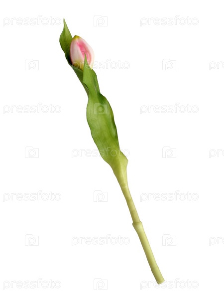 Один яркий розовый тюльпан с пышными зелеными листьями представлен изолированно на простом белом фоне