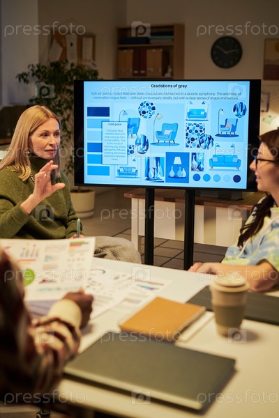 Молодая женщина, возглавляющая встречу творческой команды, обсуждает концепции дизайна