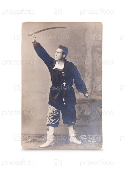 Старая открытка с портретом русского драматического актера Якова Тинского в роли Дмитрия Претендента, изолированного на белом фоне. конец XIX - начало XX века. надпись означает "Тинский