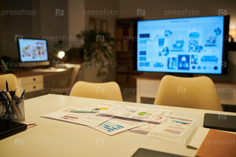 Деловые документы, лежащие на столе в офисе во время маркетинговой презентации