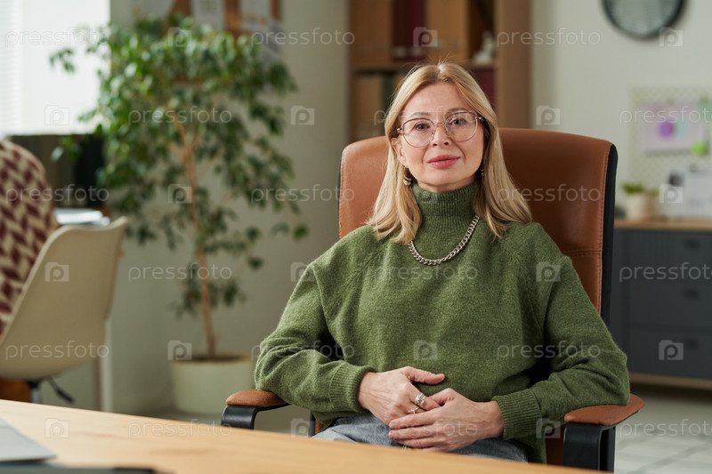 Портрет взрослой женщины, уверенно сидящей в офисном кресле