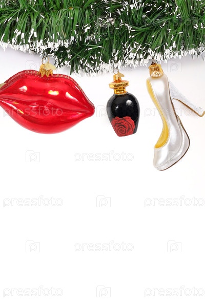 Рождественская гирлянда с рождественскими игрушками в виде модных аксессуаров, изолированной на белом фоне