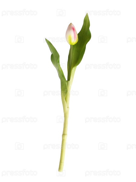 Один яркий розовый тюльпан с пышными зелеными листьями представлен изолированно на простом белом фоне