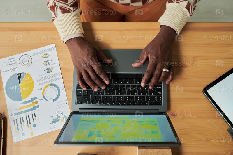 Молодой чернокожий мужчина печатает на клавиатуре ноутбука, анализируя графики