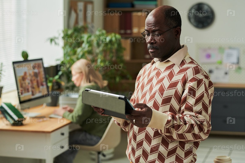 Старший чернокожий человек просматривает информацию о цифровом планшете в офисном рабочем пространстве