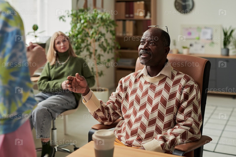 Чернокожий мужчина жестикулирует, слушая во время заседания старшего офиса