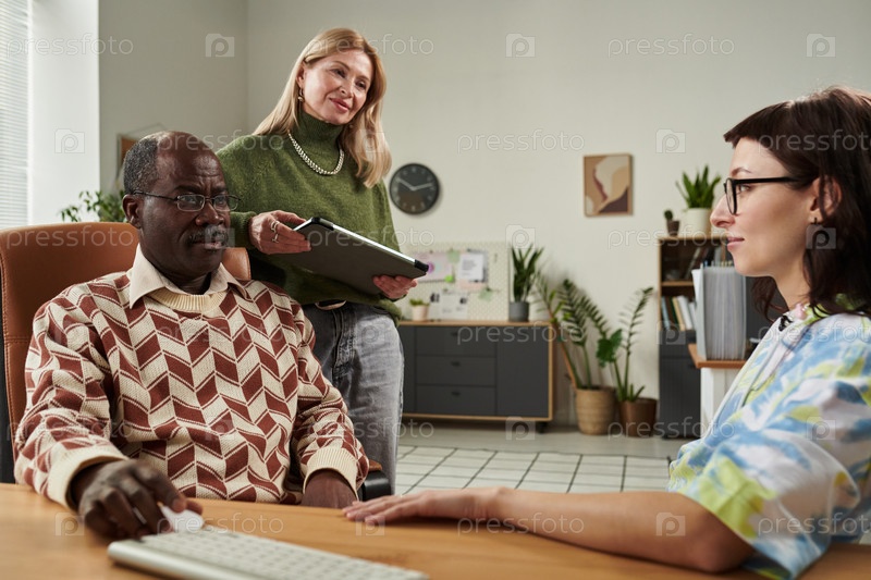 Старший чернокожий обсуждает проект с молодыми женщинами в офисе