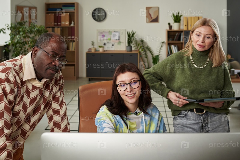 Мультиэтнический взрослый мужчина и женщина, сотрудничающие с молодой женщиной