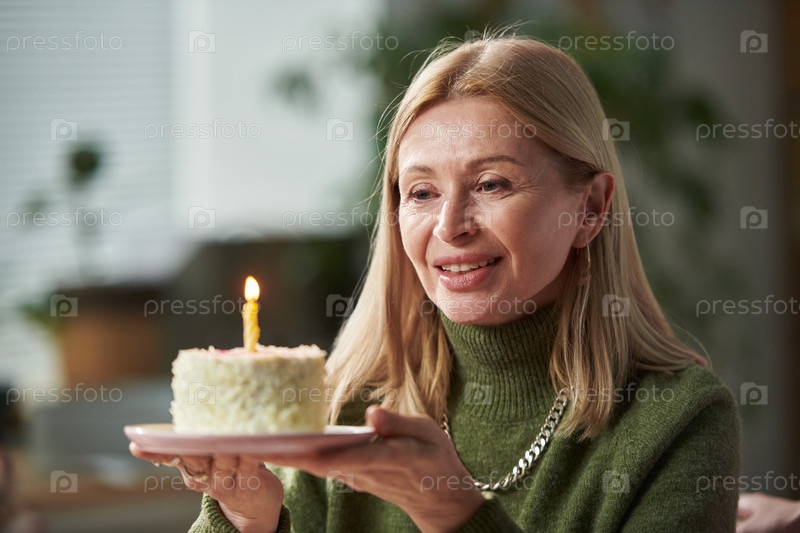 Взрослая женщина улыбается, держа рождественский торт со свечой