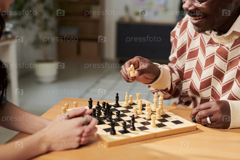 Чернокожий мужчина играет в шахматы с молодой старшей женщиной внутри дома