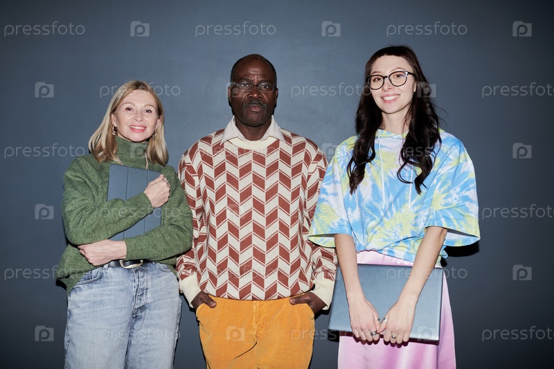Портрет разнообразного взрослого мужчины с двумя женщинами, держащими ноутбуки