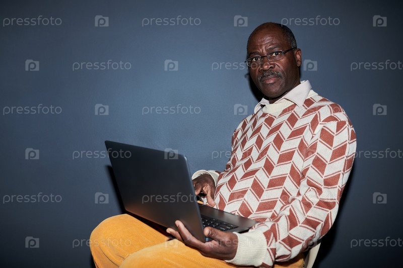 Портрет старшего чернокожего мужчины, использующего ноутбук и смотрящего на камеру