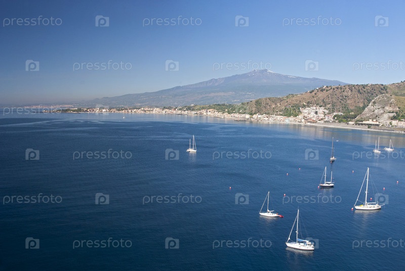 Панорамный вид на береговую линию Таормины с яхтами и Этной, Сицилия, Италия