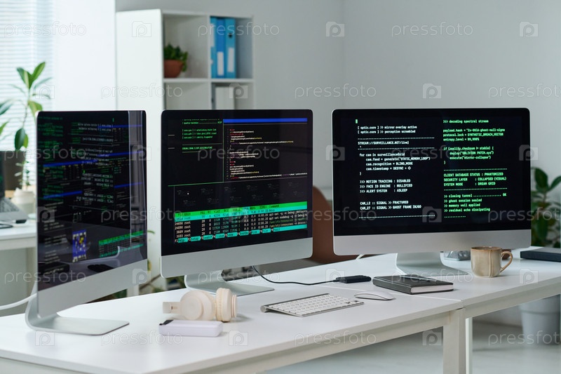 Компьютерные мониторы, отображающие программный код в офисной обстановке Three