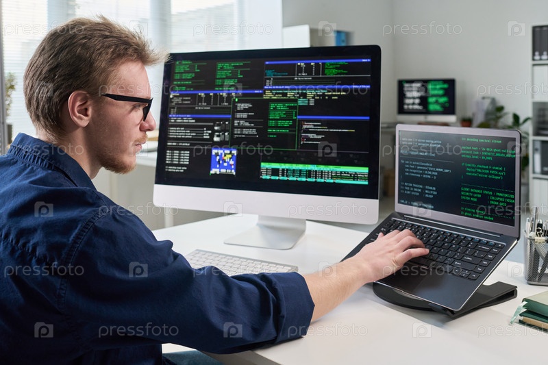 Молодой человек работает на компьютере и ноутбуке в офисе