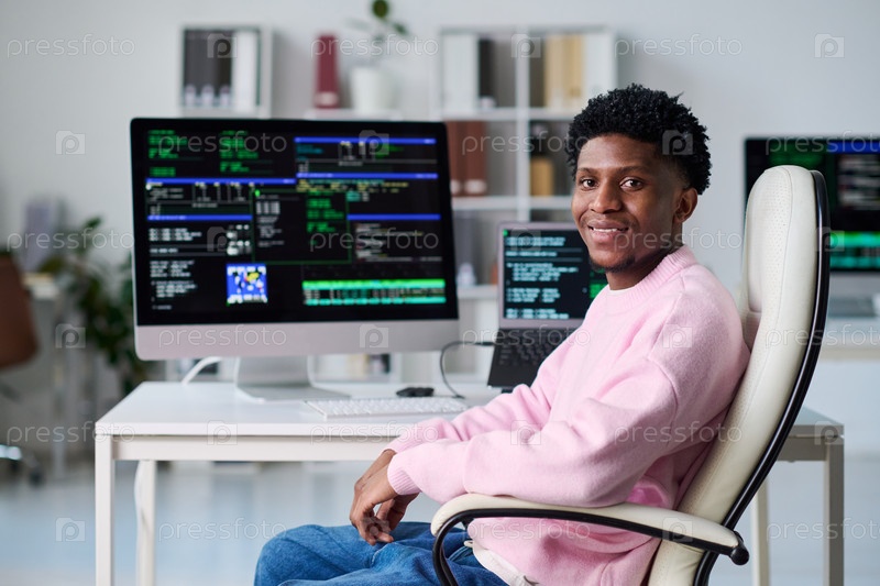 Портрет молодого чернокожего мужчины, работающего на компьютере в офисной обстановке