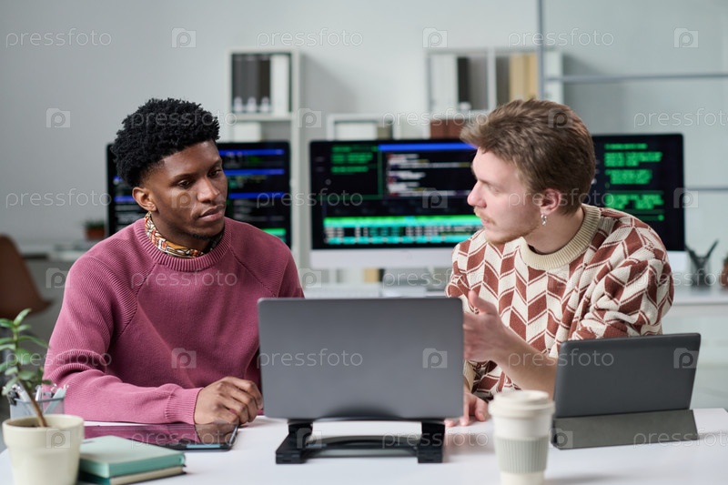 Молодой человек объясняет проект молодому чернокожему мужчине в офисной обстановке